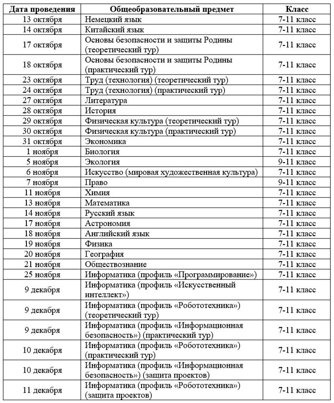 Муниципальный этап в очном формате проводится в параллелях 9-11 классы по 10 предметам: английский язык, география, история, искусство (МХК), литература, право, обществознание, русский язык, экология, химия, а также в параллелях 7-11 классов по математике.